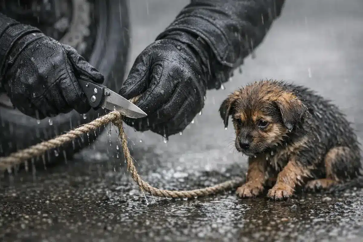 Sur une petite route de campagne noyée sous une pluie battante, un motard s’arrête net : quatre chiots terrorisés, attachés au bord de la route, viennent de changer sa soirée… et leur destin.
