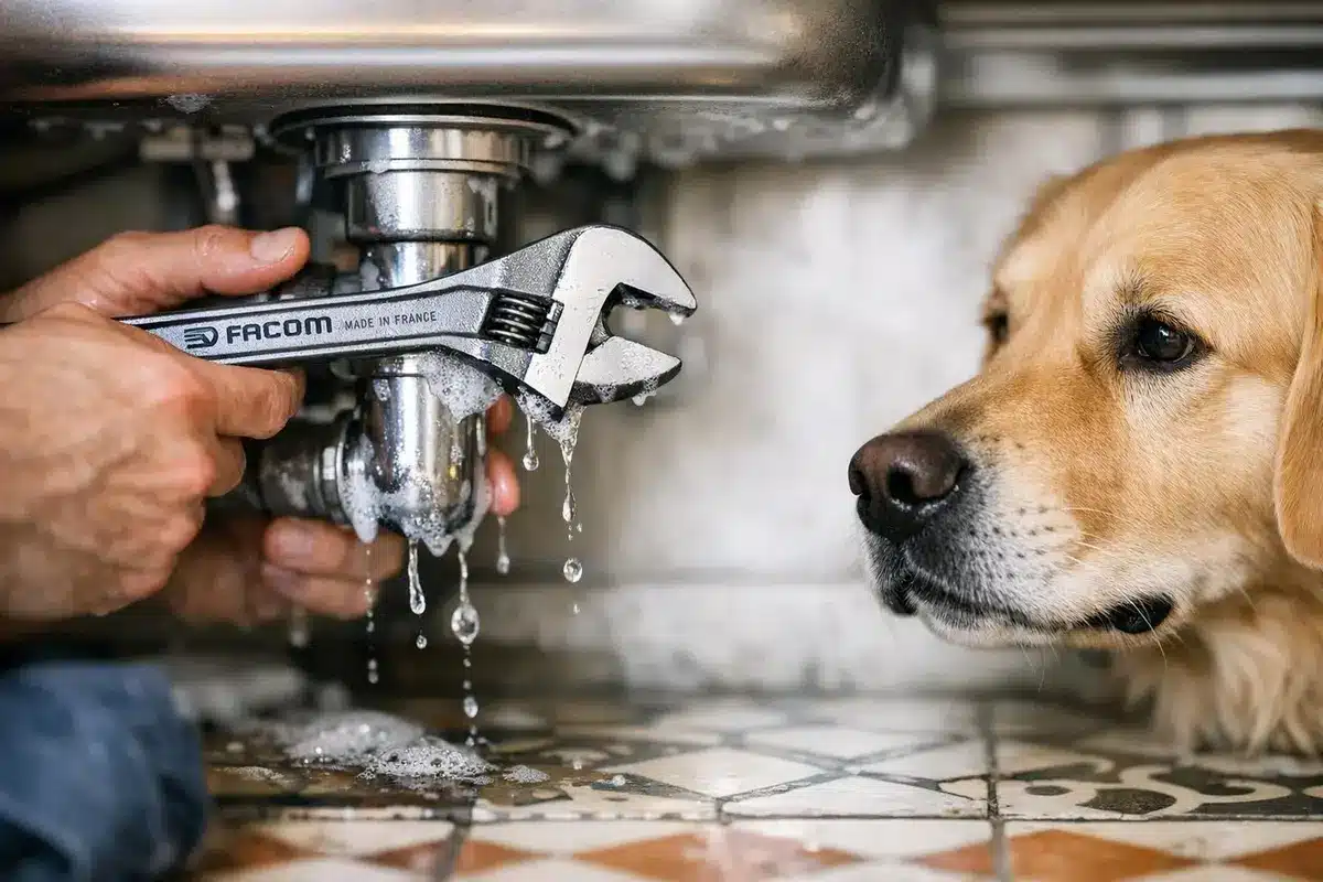 Même si la scène prête à sourire, l’aide du Golden Retriever reste évidemment toute symbolique. L’artisan doit composer avec ce compagnon encombrant, qui ralentit l’intervention plus qu’il ne la facilite. Au lieu de se concentrer uniquement sur le bouchon de l’évier, il doit aussi faire attention à ne pas cogner le chien, à ne pas laisser traîner d’outils dangereux à portée de truffe, et à travailler dans un espace déjà restreint, encore réduit par la présence du toutou.